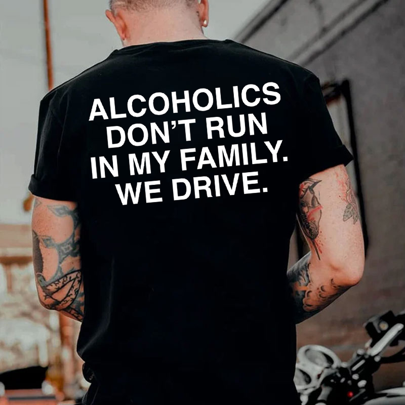 ALCOHOLICS DON'T RUN IN MY FAMILY WE DRIVE Print Men's T-shirt