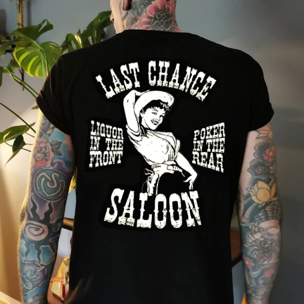 LAST CHANCE SALOON LIQUOR IN THE FRONT POKER IN THE REAR Cowgirl Print Men's T-shirt