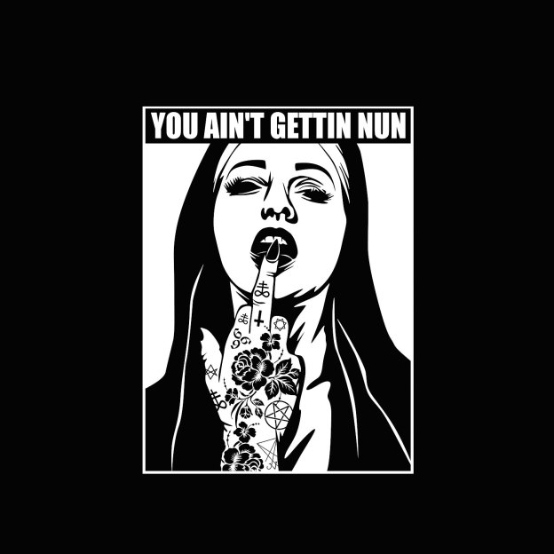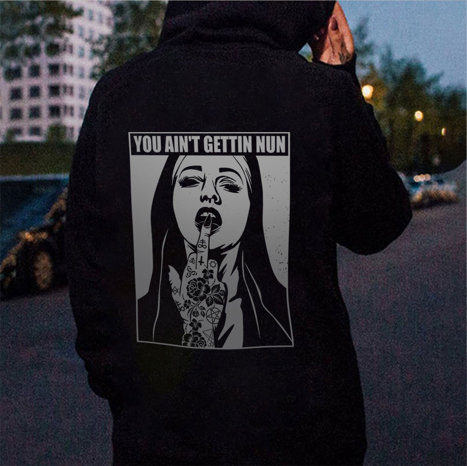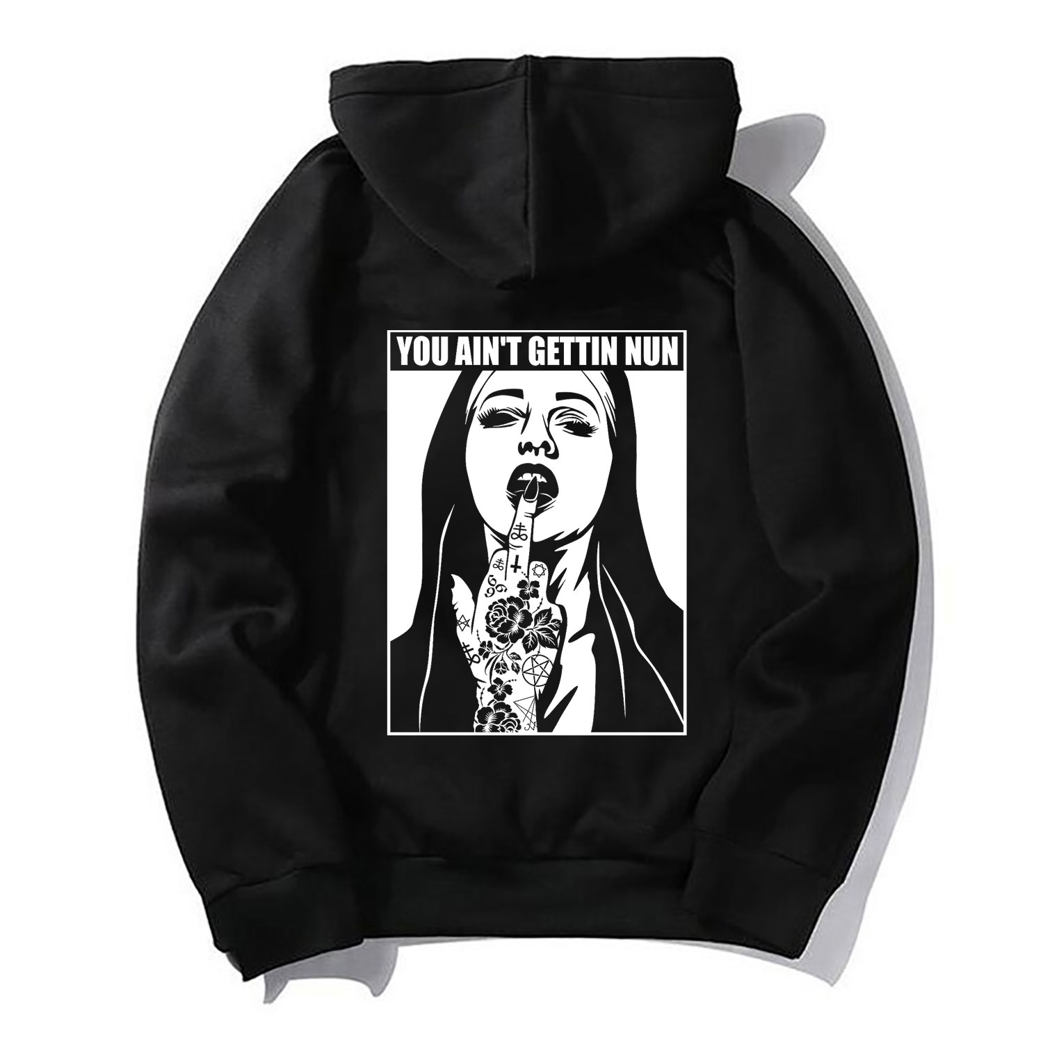 YOU AIN’T GETTING NUN with Rose Tattoo on Hand Black Print Hoodie